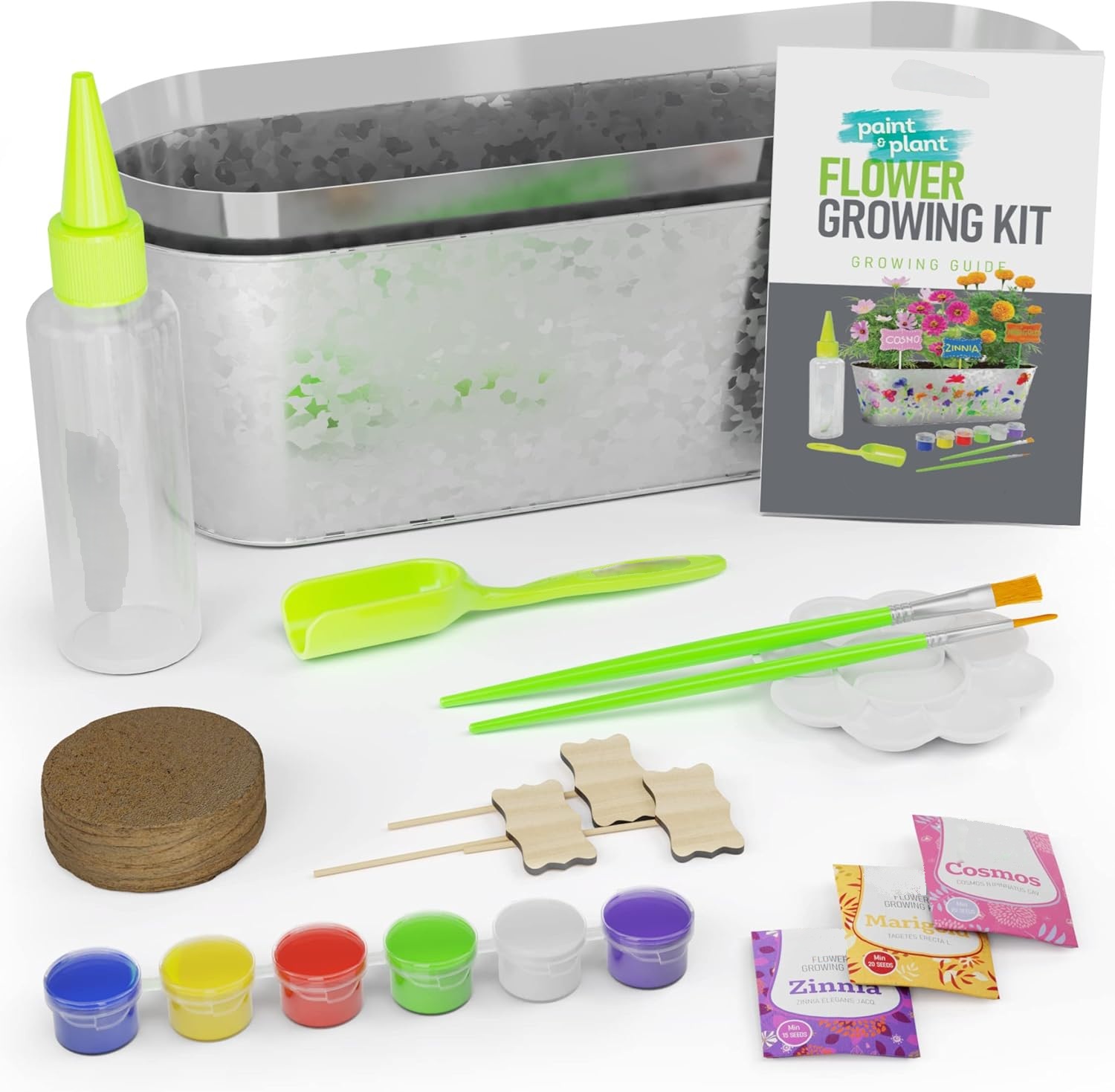 The flowers start to grow in a few days. Water the plants, and watch them flourish! Paint the planter and plant markers, and sow the Marigold, Cosmos, and Zinnia flowers - with vibrant colors and pleasant scents. Follow along with the included step-by-step instructions.